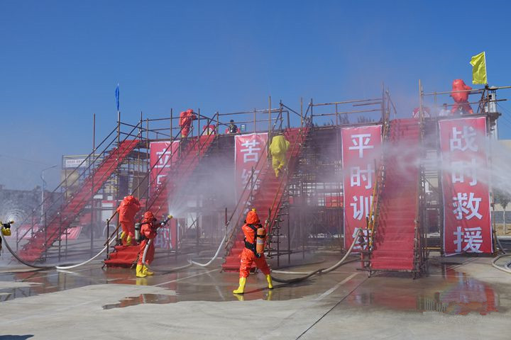 本屆競賽個人項目設置了理論考試、綜合體能、帶壓快速堵漏、單兵搶險救援等四大科目,集體項目為化工裝備初期火災處置,競賽科目設置立足救援任務,理論與體能相結(jié)合,技能與演練相結(jié)合。個人技能體現(xiàn)“實戰(zhàn)”,個人技能科目要求先佩戴呼吸器后競賽,模擬在實戰(zhàn)情況下完成競賽科目。綜合演練體現(xiàn)“實景”,最大限度還原事故現(xiàn)場。